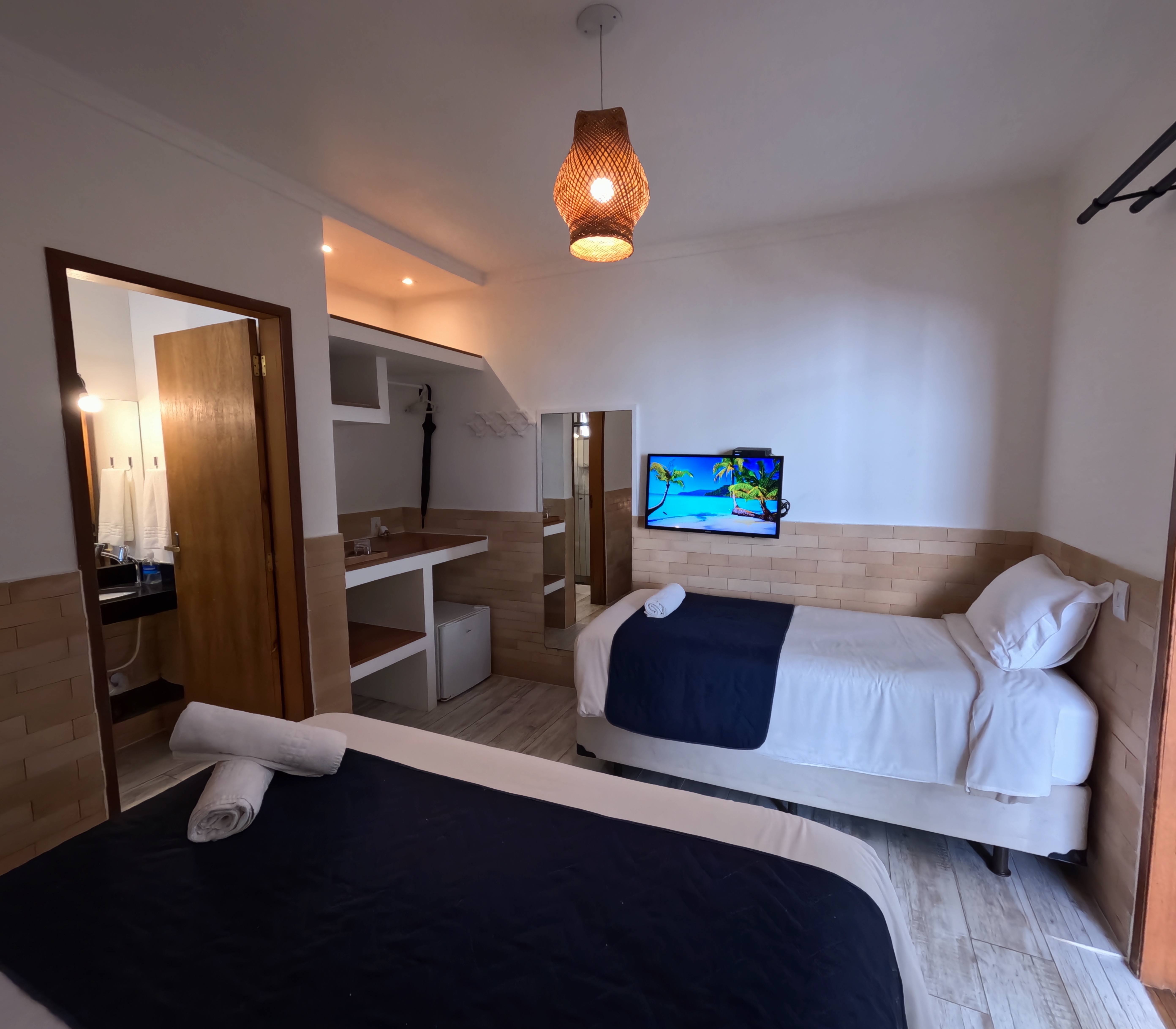 Quarto com 20m², contendo 1 cama de casal + 2 camas de solteiro Este quarto é ideal para famílias ou grupos de até quatro pessoas, oferecendo espaço e conforto necessário para todos.
